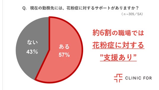 働く花粉症の人309名を対象に、現在の勤務先における花粉症への支援有無について調査したところ、57%が「ある」と回答しました。花粉症が仕事のパフォーマンス低下に大きく影響する中、約6割の職場では花粉症に対する支援が行われていることがわかりました。