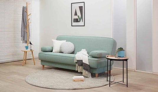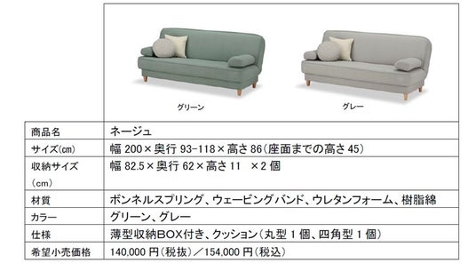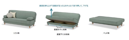 ソファからベッドへの操作も簡単にでき、座面下には収納スペースを確保、ブランケットやクッション、シーツ類などをすっきりと収納できます。カラーは人気のスモーキーカラー2色(グリーン、グレー)を展開。