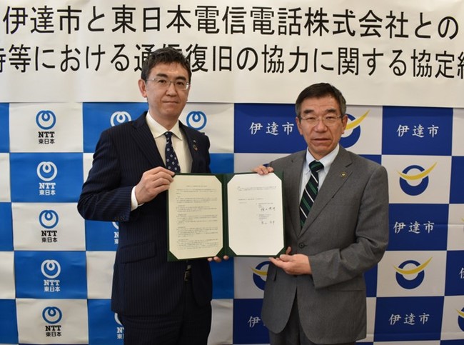 伊達市(市長:須田博行)と東日本電信電話株式会社福島支店(支店長:畠山良平、以下「NTT東日本」)は、災害時の相互協力による通信中断の早期復旧に向けた「災害時における通信復旧の協力に関する協定書」を締結しました。