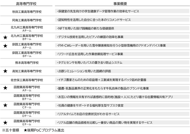 当社は、今回の「ビジネスプラン成果発表会」にて発表した14チームの内、「イノベーションの可能性を秘めている」「事業として実現・持続できる」「地域社会から応援される」という3つの観点を踏まえ、「後期PoCプログラム」に進む6チームを決定しました。