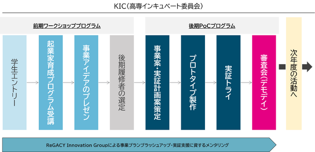 ReGACY Innovation Group株式会社(本社:東京都千代田区、代表取締役:成瀬 功一)は、全国の高等専門学校向けに提供する未来技術を支える人財の育成・輩出を目的としたインキュベートプロジェクト「KOSEN Incubate Committee(高専インキュベート委員会、以下KIC)事業」(https://kosen-incubate.jp/)の参加校が決定し、2023年度プログラムを開始したことをお知らせします。2023年度は昨年度から参加校が増加し、12校の参画、合計18チームが前期ワークショッププログラムを受講しており、その内8校14チームが事業構想の成果を発表する「ビジネスプラン成果発表会」を9月2日に開催いたしました。また、14チームの内、6チームが後期PoCプログラムへ進むことを決定しました。