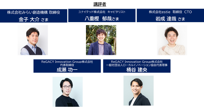 「前期ワークショッププログラム」では、事業創造のために必要なアントレプレナー思考をワークショップ形式で実施し、並行してメンタリングを通じた事業プランニングを行いました。そして、「ビジネスプラン成果発表会」にて、その成果を「株式会社estie 取締役 CTO 岩成 達哉様」、「ユナイテッド株式会社 投資事業本部 キャピタリスト 八重樫 郁哉様」、「株式会社みらい創造機構 取締役 / 共同創業者 金子 大介様」、「ReGACY Innovation Group株式会社 代表取締役社長 成瀬 功一」、「ReGACY Innovation Group株式会社 Consulting Manager/一般社団法人ローカルイノベーション協会 代表理事 桶谷 建央」に対して発表しました。