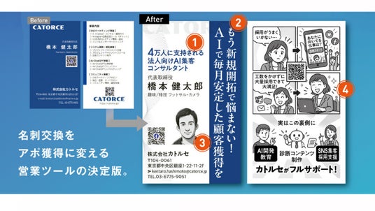 株式会社カトルセ(本社:東京都中央区、代表取締役:橋本健太郎、以下カトルセ)は名刺交換を商談につなげやすく開発された名刺作成サービス【アポ名刺AI】をリリースいたしました。
