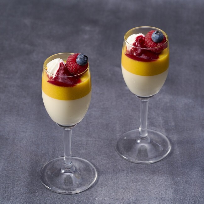 上品な甘さのホワイトチョコレートムースにかぼちゃの濃厚なムースを重ねて、ラズベリーのソースがアクセント。ぜひ3つの層をひと口に味わって。意外な組み合わせの見事なマリアージュをお楽しみいただけます。