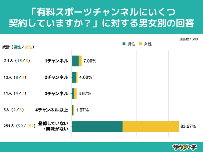 10代~30代男女を対象とした『有料スポーツチャンネルにいくつ契約していますか?』というアンケートで、最も多かった回答は「登録していない・興味がない」で83.67%でした。