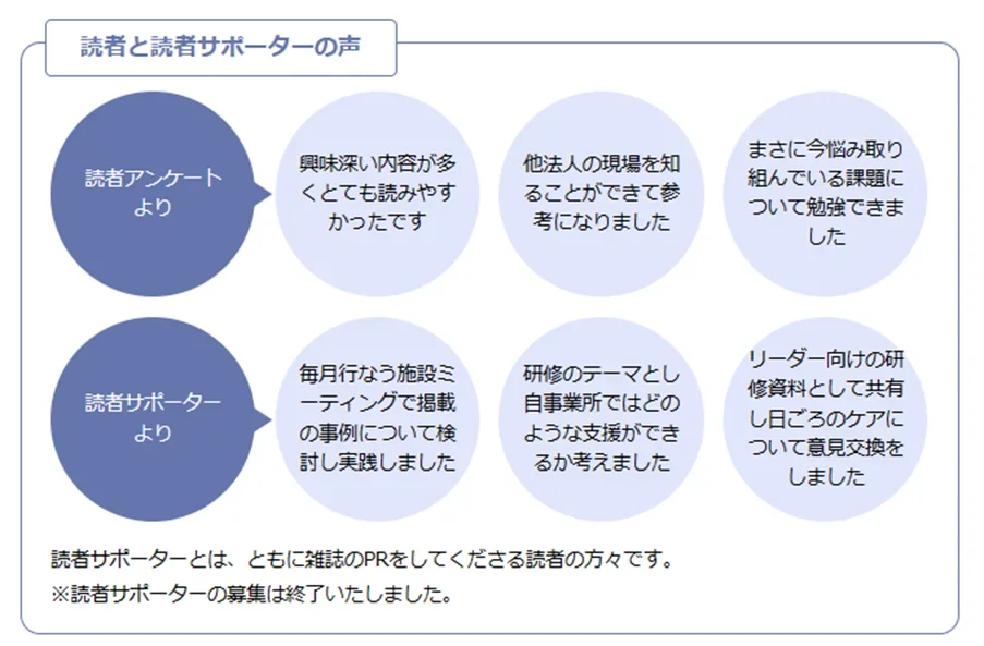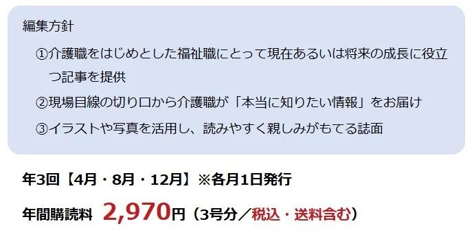 毎号変わる特集テーマと、幅広い分野の連載記事。福祉の現場へ最新の情報をお届け!