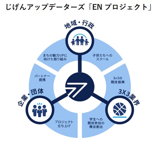 じげんアップデーターズでは、チームスローガン「UPDATE the YOUTH -若者の挑戦を応援-」のもと、チームの活動を通じて関わる多くの皆さまとのご縁を大切に、持続的な地域の発展、挑戦機会の創出などを目的とした『EN プロジェクト』を開始しています。プロジェクトを通じて、より3x3の競技やチームを知っていただけるきっかけにもなるような、さまざまな取組みを行ってまいります。京都市を中心とした、様々な企業や団体のパートナーの皆様の協力を得ながら、本プロジェクトの推進を進めてまいります。