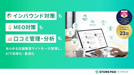 STOREPADは、23の国内事業者向け店舗集客メディアと連携する、店舗情報発信・分析プラットフォームです。地図アプリ・ポータルサイト・インバウンド向けメディア・SNS・HPなど様々な媒体への一括情報発信や口コミ分析で工数削減と集客向上、効果的なMEOを実現。店舗運営を成功に導きます。
