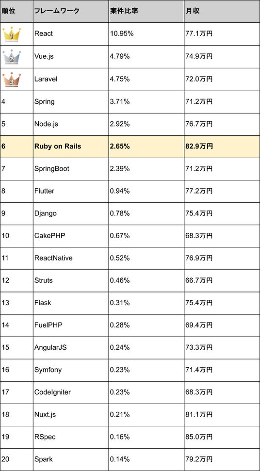 Ruby on Rails案件は市場全体の2.65%を占め、フレームワーク別案件数ランキング6位、平均月額単価82.9万円と安定しています。