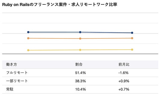 2025年7月時点のRuby on Railsフリーランス案件・求人におけるリモートワーク比率は、フルリモート51.4%、一部リモート38.3%、常駐10.4%です。フルリモートは前月比1.6%減、一部リモートは0.9%増、常駐は0.7%増となりました。