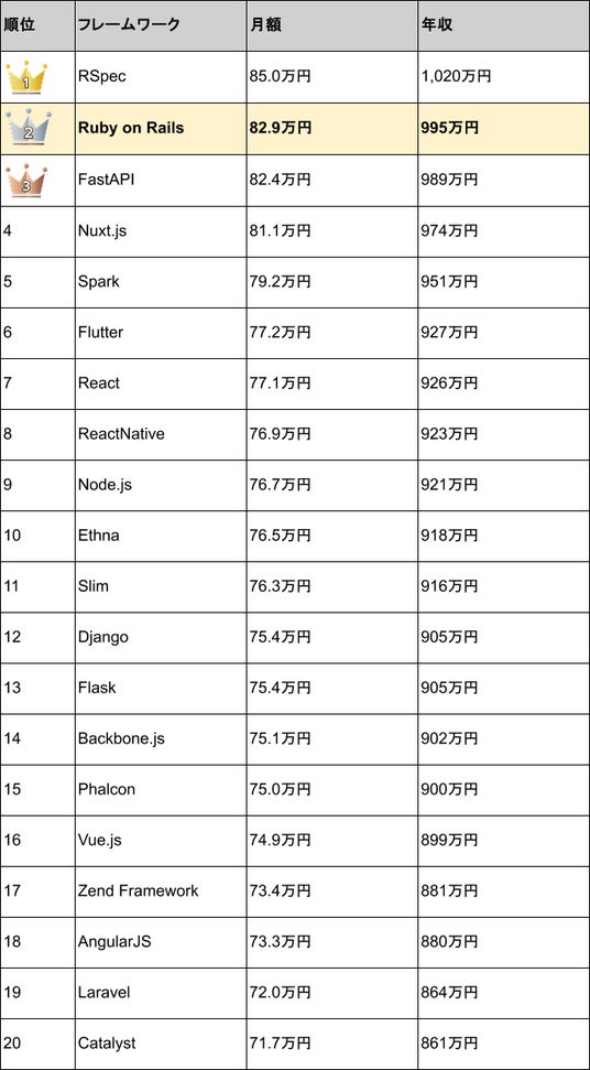 Ruby on Rails案件の平均月額単価は82.9万円、平均年収は995万円で、フレームワーク別年収ランキングでは2位です。Convention over Configurationの設計思想によりMVCパターンが自動的に連携し、少人数でも高速開発できる点が人気の理由です。