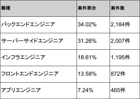 Ruby on Rails案件の職種では、バックエンドエンジニアが34.02%(2,184件)で最多となり、サーバーサイドエンジニアが31.26%(2,007件)、インフラエンジニアが18.61%(1,195件)、フロントエンドエンジニアが13.58%(872件)、アプリエンジニアが7.24%(465件)と続きます。