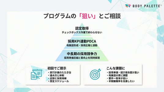 本プログラムでは、認定取得をゴールにせず、採用単価の圧縮、応募母集団の量と質の改善、要件一致率の向上、早期離職率の低減といった採用KPIと連動させ、取得から更新、採用広報への実装までを一気通貫で支援します。