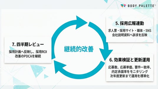 6)効果検証と更新運用:応募数、応募単価、要件一致率、内定承諾率をモニタリングし、次年度更新まで運用を標準化