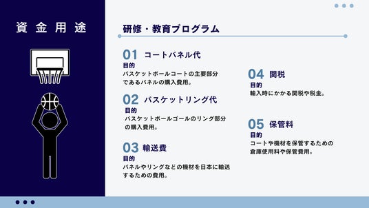 クラウドファンディングによって集められた資金は、移動式バスケットボールコートの購入、イベント開催の運営費に使用されます。コートは地域の学校や公園、イベントスペースなどで活用され、子どもたちがいつでもどこでもバスケットボールを楽しめる環境を提供します。