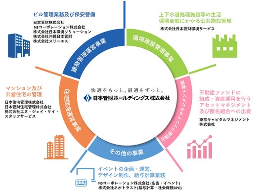 日本管財ホールディングスは、オフィスビルや商業施設等の建物管理運営事業や住宅管理運営事業、環境施設管理事業、不動産ファンドマネジメント事業など、建物管理とその周辺事業を手掛ける企業の持株会社として、2023年4月3日に発足しました。