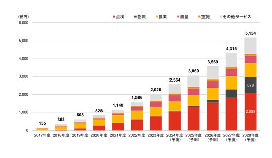 日本国内におけるドローンビジネス市場規模※3は、年平均成長率38%で拡大傾向にあり、領域別では建設・建築業界における点検の規模と成長が大きく、2028年度には約2,088億円まで伸びると予測されています。
