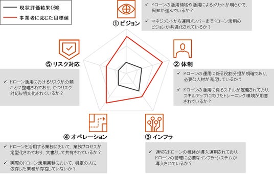 一次アセスメントは無料で提供します。企業が簡易的なアンケート形式の設問に回答することで、自社のドローン事業にとって加えるべき観点を5つの評価軸で分析し、レーダーチャートにより課題を可視化します。