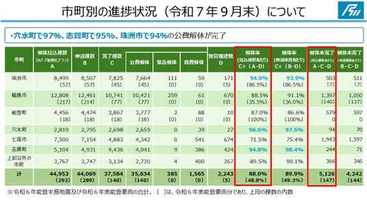 市町別の公費解体の進捗状況(令和7年9月末時点)