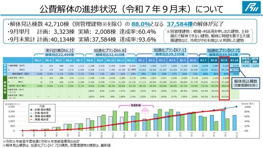 現状の解体ペースを維持すれば、10月末の解体率は、県全体で93~95%と、解体完了目標をおおむね達成する見込となっていますが、解体完了が11月以降にずれ込む建物は、別管理建物を除き、2,000から3,000棟になると見込まれています。
