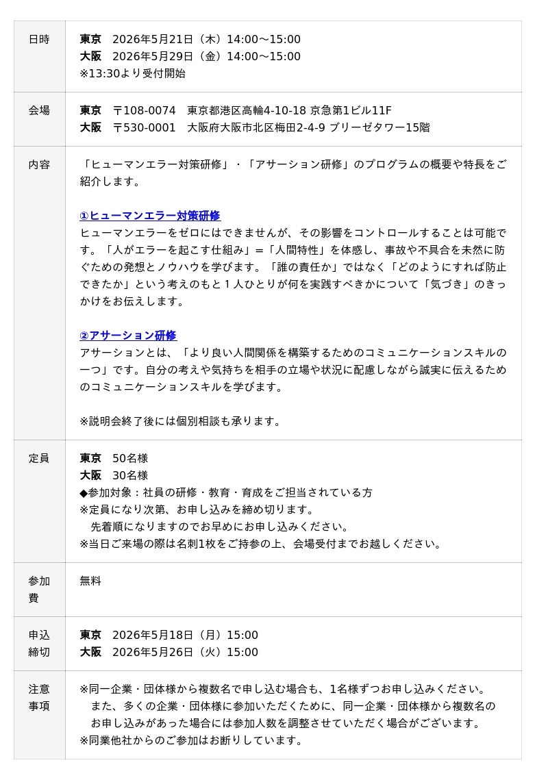 ANAビジネスソリューション株式会社(本社:東京都大田区/代表取締役社長:植野 素明)は、2026年5月21日(木)に東京(品川)、5月29日(金)大阪(梅田)で「研修プログラム説明会」を開催します。