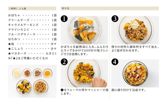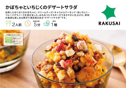 加熱したほくほくのかぼちゃに、クリームチーズ・キャラメルアーモンド・白いちじく・フルーツグラノーラを混ぜました。はちみつとマヨネーズでまろやかに仕上げた、具材の食感も楽しめる贅沢で満足感のある“デザートサラダ”です。