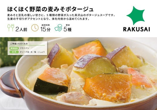 d130004-50-701c14d97a7e9d23de3d3775eadad30f.pdf 楽彩株式会社(本社:東京都足立区/代表取締役社長:大崎善保)は、ハロウィーンにあわせて“ほくほく野菜の麦みそポタージュ”“ベーコンとくるみのかぼちゃサラダ”“かぼちゃといちじくのデザートサラダ”の3品を10月21日(月)より販売いたします。旬のかぼちゃを使ったお料理で、見た目も鮮やかにハロウィーンをお楽しみください。