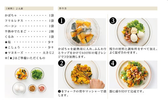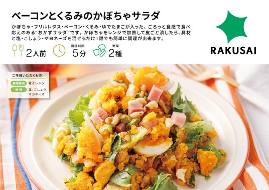 かぼちゃ・フリルレタス・ベーコン・くるみ・ゆでたまごが入った、 ごろっと食感で食べ応えのある“おかずサラダ”です。 かぼちゃをレンジで加熱して皮ごと潰したら、具材と塩・こしょう・マヨネーズを混ぜるだけ!誰でも簡単に調理が出来ます。