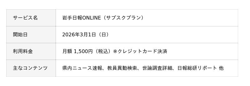 - 申込方法: 岩手日報ONLINE( https://www.iwate-np.co.jp/content/guide/ )より無料会員登録の上、有料プランへお申し込みください。