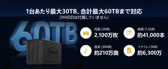 最大60TB(2×30TBドライブ)をサポートし、2100万枚の写真「3MB」、6300万のドキュメント「1MB」、4.1万本のHD映画「1.5GB」、210万曲「30MB」のロスレス音源を余裕で保存。大容量データの一括管理に理想的です。