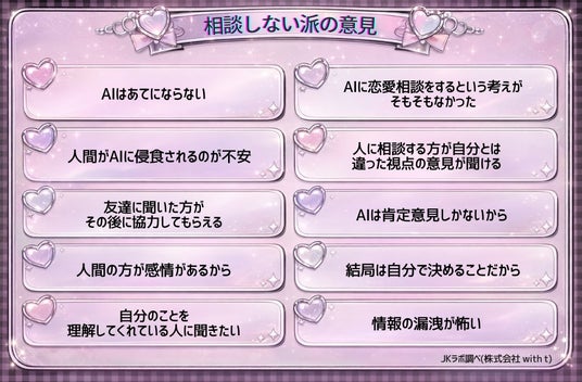 256人を対象にした追加アンケートでは、「AIに恋愛相談をする」と答えた女子高生が7割を超え、圧倒的多数となりました。一方で、相談しながらも彼女たちが抱く「AIへの不信感と不安」という相反する本音も浮き彫りになっています。