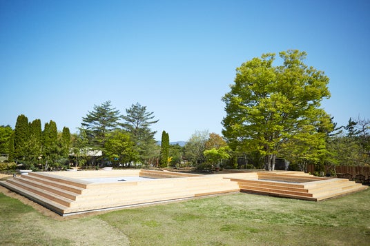 富士山の麓、芝生のガーデンにサウナテントとプールを設置