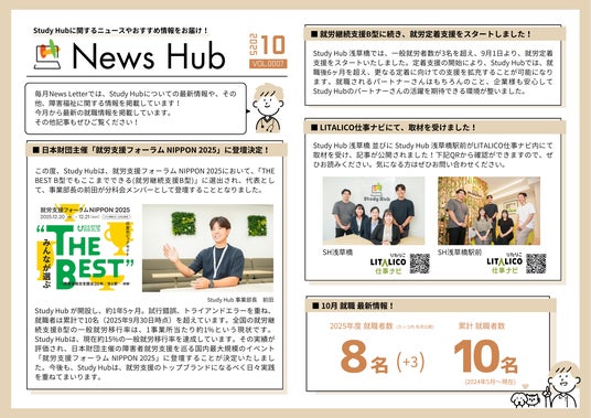 10月号では、Study Hub 事業部長(前田 崇宏)の日本財団主催「就労支援フォーラム NIPPON 2025」の登壇について、就労定着支援事業指定取得のお知らせ、LITALICO仕事ナビ記事掲載のお知らせ、就職実績速報などについて紹介しています。