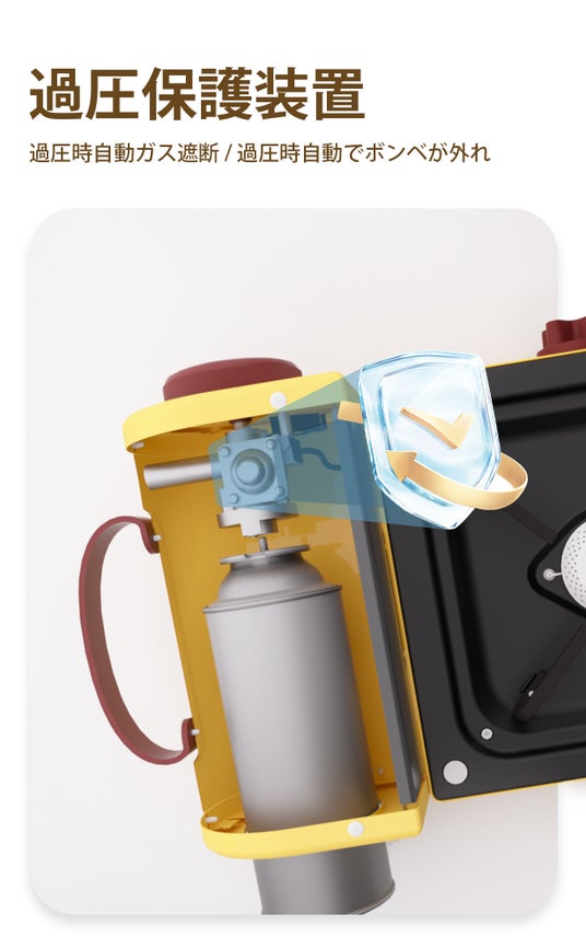 本製品はガスを取り扱うため、安全機能が充実しています。カセットボンベの圧力が異常に上昇した際、自動的にガスを遮断する「圧力感知機能」を搭載しており、安心して使用できます。また、簡単に着脱でき、過熱時には自動で外れる「マグネット式」の受け口も備わっています。