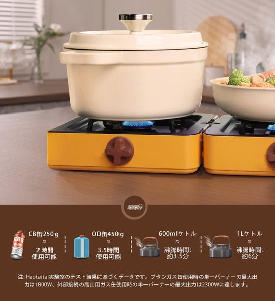 この2バーナーアウトドアコンロは、適切なバーナー間隔を確保しており、同時に複数の調理器具を使用することができます。バーナー間の距離がしっかりと設計されているため、8cm~21cm範囲の様々なサイズや形状の調理器具に対応しています。