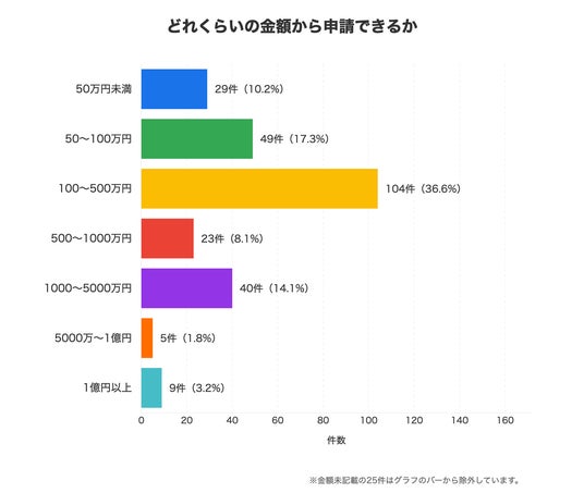 100~500万円帯が最も多く約4割を占め、複数のソフト導入や機器とのセット導入に使える制度が並んでいます。1,000万円超の制度も約2割あり、基幹システムの刷新や大型設備との一体導入を予定している場合も選択肢があります。