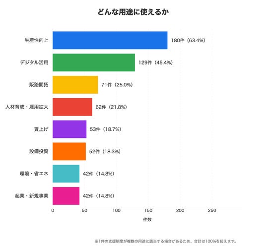 用途別では「生産性向上」が約6割、「デジタル活用」が約4割で並びます。両用途を兼ねる制度が106件あり、業務効率化とデジタル化を一体で進めたい場合は両用途を指定して候補を絞る方法が取れます。