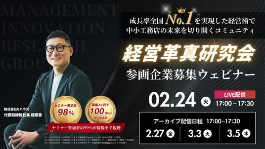 株式会社Gハウス(所在地:大阪府大阪市旭区、代表取締役社長:趙 晃啓)は、中小工務店向けの経営コミュニティ「経営革真研究会」の説明会ウェビナーを、2026年2月24日(火)にLIVE配信、ならびに2月27日(金)、3月3日(火)、3月5日(木)にアーカイブ配信にて開催いたします。