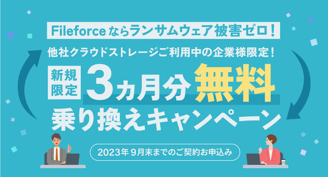 ファイルフォース株式会社(本社:東京都千代田区、代表取締役:サルキシャン・アラム) は、2023 年9月30 日までの期間限定で、他社クラウドストレージサービスから、同社が提供する法人向け国産クラウドストレージFileforceに乗り換えされる法人および団体向けに3ヵ月分を無料で提供する特別キャンペーンを実施いたします。