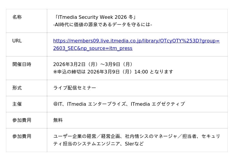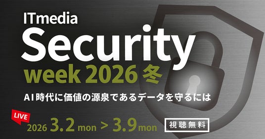 アイティメディア株式会社(本社:東京都千代田区、代表取締役社長 兼 CEO:小林教至、以下アイティメディア)は、2026年3月2日(月)~3月9日(月)に「ITmedia Security Week 2026 冬」を開催します。本イベントは「@IT」「ITmedia エンタープライズ」「ITmedia エグゼクティブ」の3媒体が主催するライブ配信セミナーで、現代に求められるセキュリティ戦略の最新動向と具体的な実践方法を「サイバーセキュリティリスクとマネジメント」「ゼロトラスト」「クラウドセキュリティ」など10のテーマで紹介します。