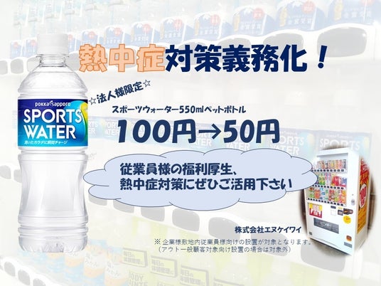 対象期間は2025年7月1日から9月30日までの3ヶ月間。通常100円で販売しているスポーツウォーター(熱中症対策飲料)を、法人設置の自販機に限り、特別価格の50円でご提供いたします。