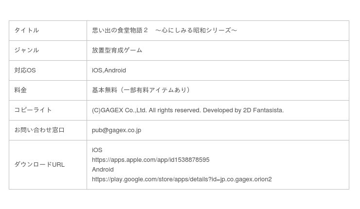 株式会社GAGEX(ガジェックス)(本社:東京都墨田区、代表取締役:井村 剣介)は、スマートフォンゲーム「思い出の食堂物語2 ~心にしみる昭和シリーズ~」を公開いたしました。