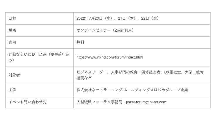 こうしたなか、教育・研修に24年間取り組んできたネットラーニンググループ(本社:東京都新宿区、代表取締役議長:岸田 徹)では、人材戦略を育成と活用面から考える「人材戦略フォーラム」を7月20日、21日、22日と3日間に渡って開催いたします。
