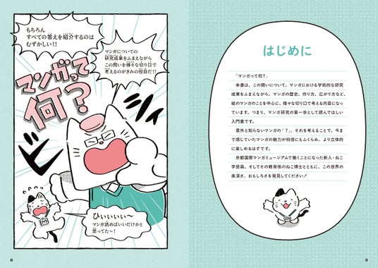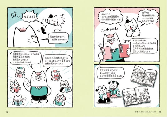 おっちょこちょいだけどやる気とマンガ愛に溢れるねこ学芸員が、ときに熱く、ときに冷静に、博士から教えを受けながら日々成長していく物語をベースに、マンガ文化を紹介します。意外と知らないマンガの「?」を考えながら、マンガのさらなる魅力を発見できる1冊です。