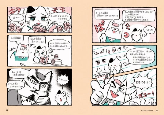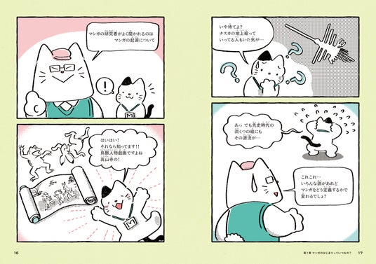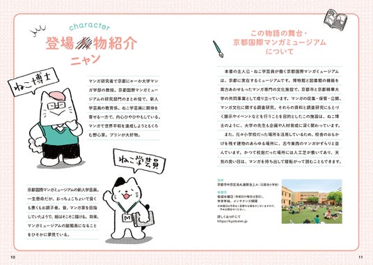 本書の登場人(ニャン)物は、京都国際マンガミュージアムで働くことになった新人・ねこ学芸員と教育係のねこ博士。