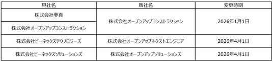 また、当社機電ユニットに属する株式会社ビーネックステクノロジーズと株式会社ビーネックスソリューションズを2026年4月1日にて、それぞれ株式会社オープンアップネクストエンジニア、株式会社オープンアップソリューションズといたします。