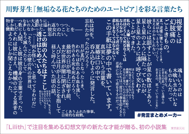 「Lilith」30首で第29回歌壇賞を受賞し、第一歌集『Lilith』で第65回現代歌人協会賞を受賞するなど、今もっとも注目を集める歌人・川野芽生による初の小説集『無垢なる花たちのためのユートピア』が東京創元社より刊行されました。