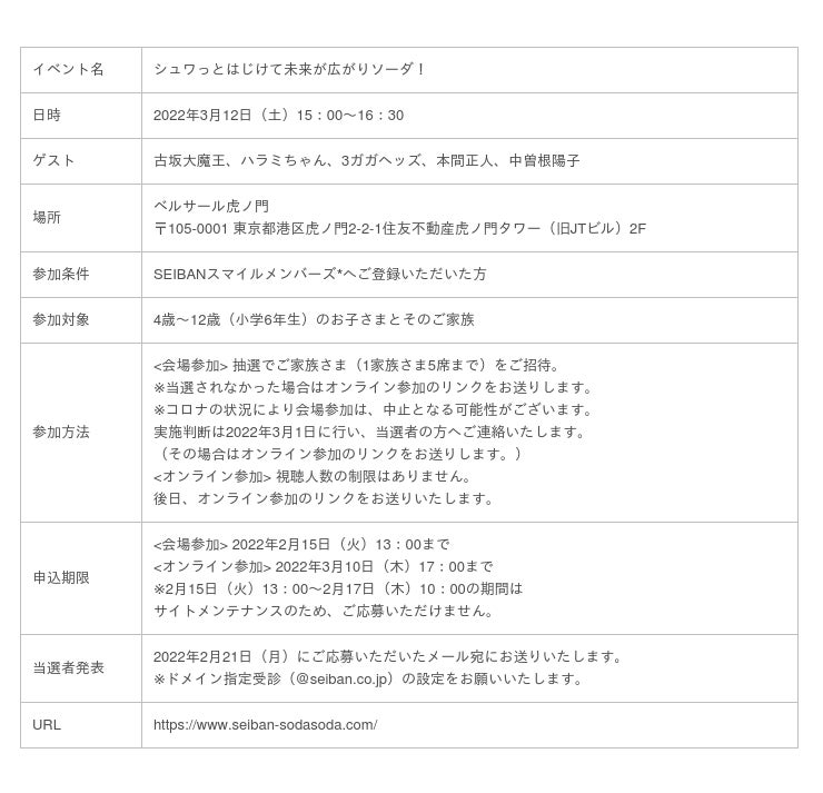 また、サイトのオープンを記念して、同日3月12日(土)にリアル×オンラインハイブリッド型イベント「シュワっとはじけて未来が広がりソーダ!」を開催いたします。