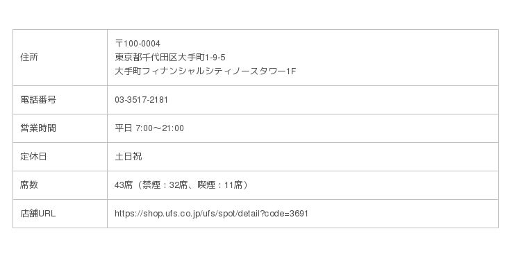 <店舗情報>上島珈琲店 大手町フィナンシャルシティ店