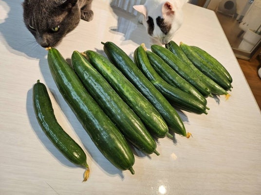キュウリの大きさ比べ(一番左が通常の大きさのキュウリ)